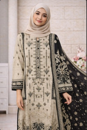 3 Piece Black and Beige Lawn Stitched Dress with Lawn Dupatta – Front Embroidered Cotton Suit for Everyday Wear